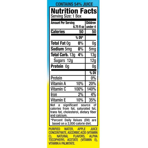 According to the label the ingredients of apple juicy juice are apple juice concentrate water ascorbic acid commonly known as vitamin c and malic acid. The fiber will help keep you full longer and youll reap the benefits of a much better nutrient profile. For example if the nutrition facts label says one serving of food contains 150 calories and 100 calories from fat the remaining 50 calories comes from carbohydrate protein andor alcohol.