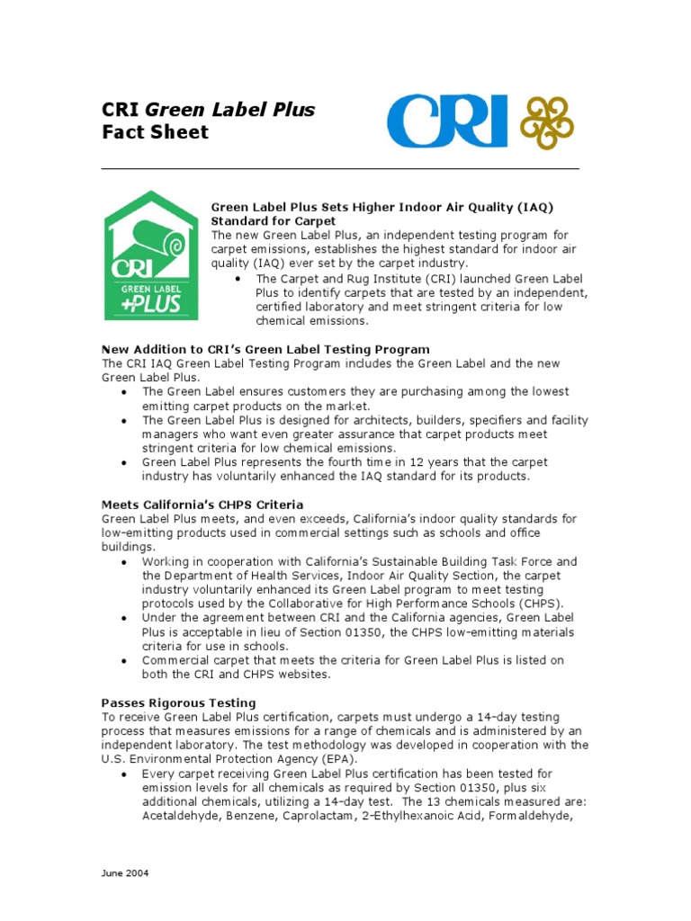 The carpet rug institute cri and the carpet cushion council announced earlier this week that the green label plus program is being opened up to pad manufacturers. Green label carpet program has such a positive impact on the indoor environment that the american lung association approves its use in its healthy homes programs. Documents are in portable document format pdf unless specified otherwise.