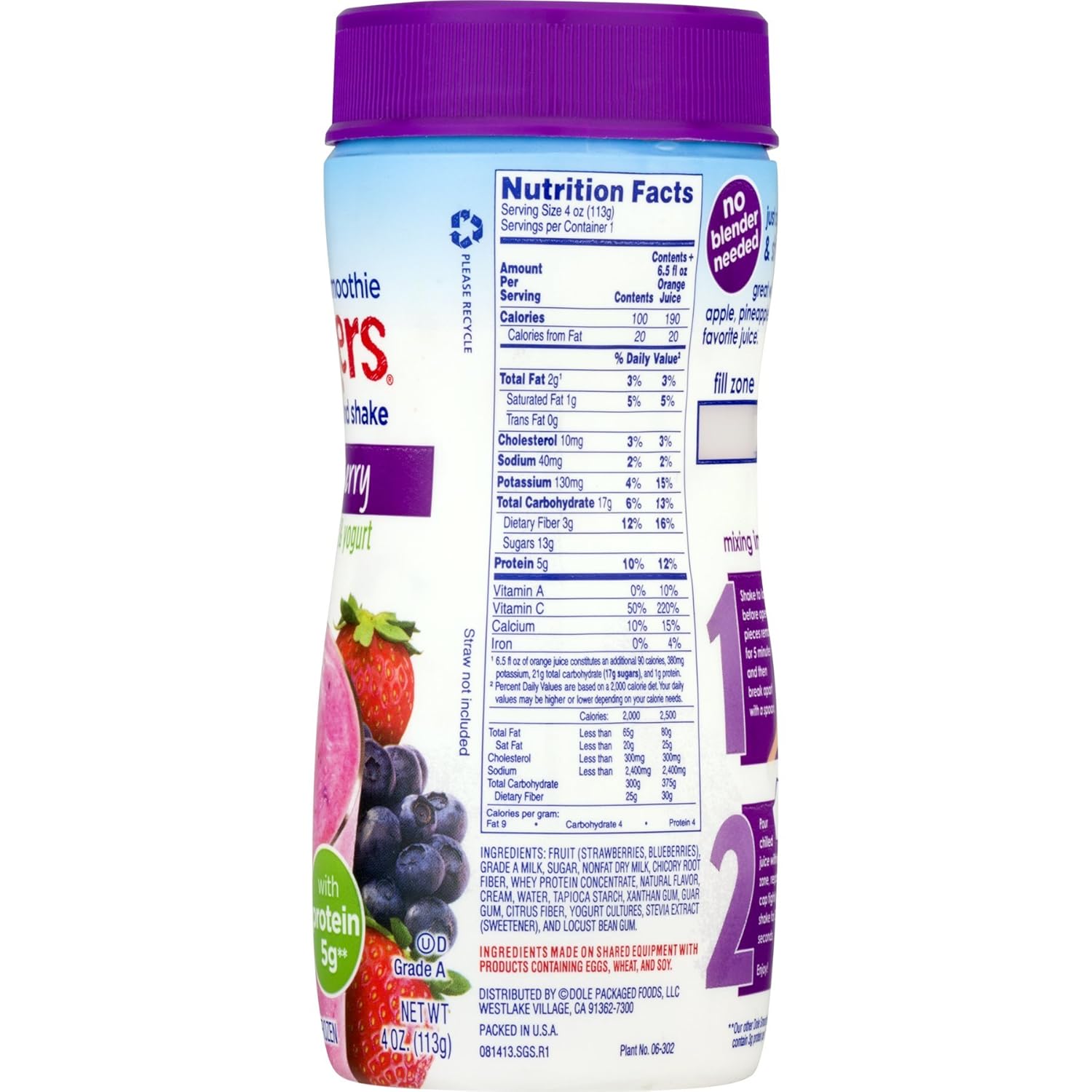 Dole shakers nutrition label. There are 100 calories in a 1 container serving of dole fruit smoothie shaker. This review is for the strawberry banana version of the dole smoothie shakers. The most wholesome frozen fruits and veggies grown under the sun.