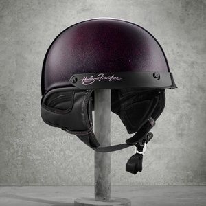 Harley davidson womens pink label ultra light j02 half helmet 98326 17vx. Part of the hd pink label collection this half helmet features a gloss black exterior with flakes of pink glitter incorporated in a fiberglass shell with spectra fiber for minimum weight coupled with maximum strength.