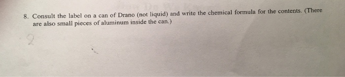 Consult the label on a can of drano not liquid and write the chemical formula for the contents. There are also small pieces of aluminum inside the can show transcribed image text consult the label on a can of drano not liquid and write the chemical formula for the contents.
