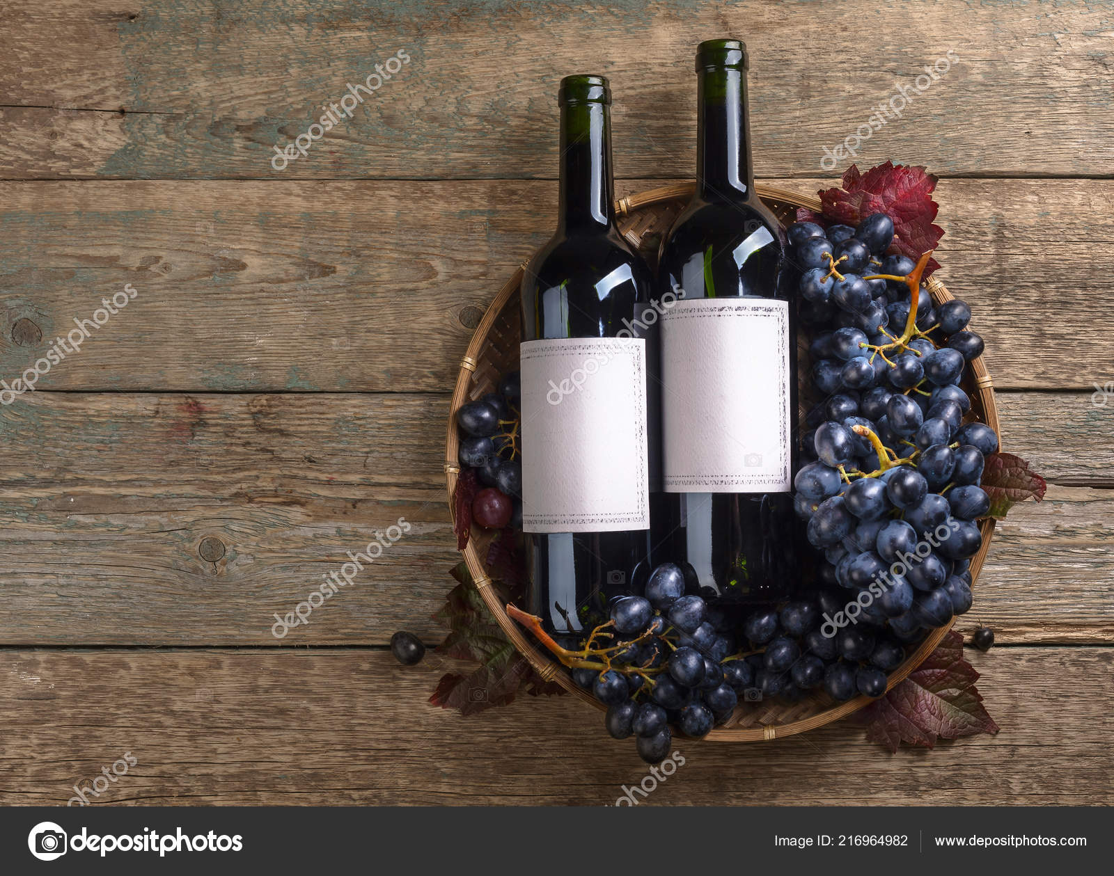 Grapes Bottles Red Wine Old Wooden Background Old Paper Label