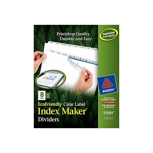 Get organized quickly and easily with avery 8 tab index maker clear label dividers with traditional colored tabs 5 sets. Whether you have a single project to create or multiple binders for a meeting or seminar these dividers help you to get it done with professional results. Big tab and extra wide selections offer greater convenience in office wide references.