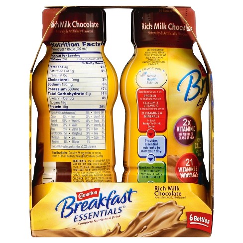 There are 220 calories in a 1 bottle serving of carnation breakfast essentials high protein. Com carnation breakfast essentials powder drink mix 1 26 oz rich milk chocolate 66 ct grocery gourmet food 4 more com carnation breakfast essentials complete nutrition drink powder rich milk chocolate 1 26 ounce 22 count pack of 2 grocery gourmet food 4 more.
