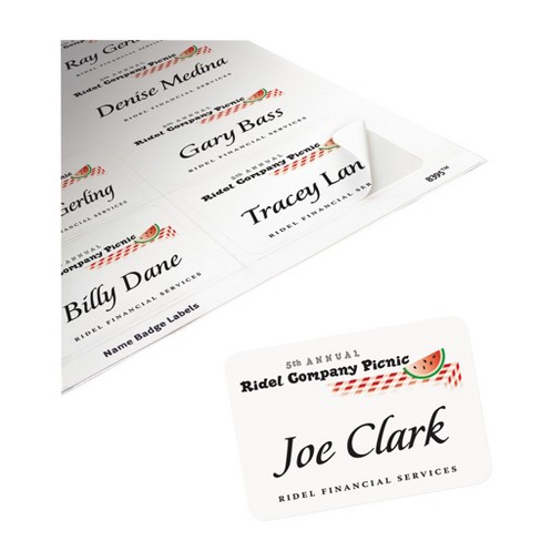 Avery label name tags. Choose from a variety of badge styles. Self adhesive name badge labels are laser and inkjet compatible. These labels are fully customizable and can be branded with your organizations logo.