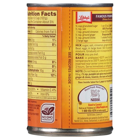 Libby canned pumpkin nutrition label. Nutrition facts for libbys canned pumpkin. Perfect as the base ingredient in sweet or savory recipes each can of libbys 100 pure pumpkin is all natural and contains no preservatives. Libbys pumpkin pie desserts.