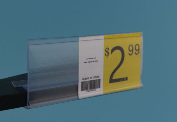 Do you change out your labels often. This angled economy info strip label holder is 1 14 inch high by 47 78 wide and is designed to fit into standard gondola shelves with a metal price tag channel on the front edge. Price tags and signs are protected with a built in clear front face.