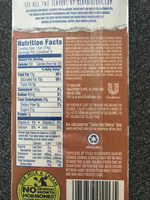 Klondike bar nutrition label. Nutrition facts for klondike bar foods sweets frozen desserts klondike bar. Key facts learn about health benefits or risks has high calorie density this means that the amount of calories you are getting from an ounce is high 012 caloz. 50 fat 46 carbs 5 protein.