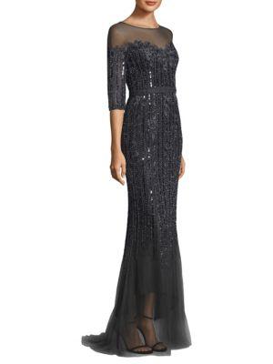 Zsodjvw Basix Black Label Illusion Beaded Tulle Skirt Gown