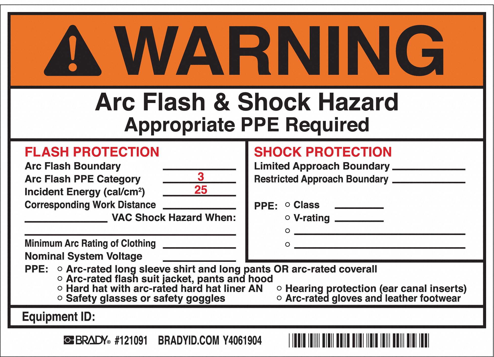 Warning ansi label warns readers that there is an arc flashshock hazard with additional blanks to fill in specific information about the hazard.